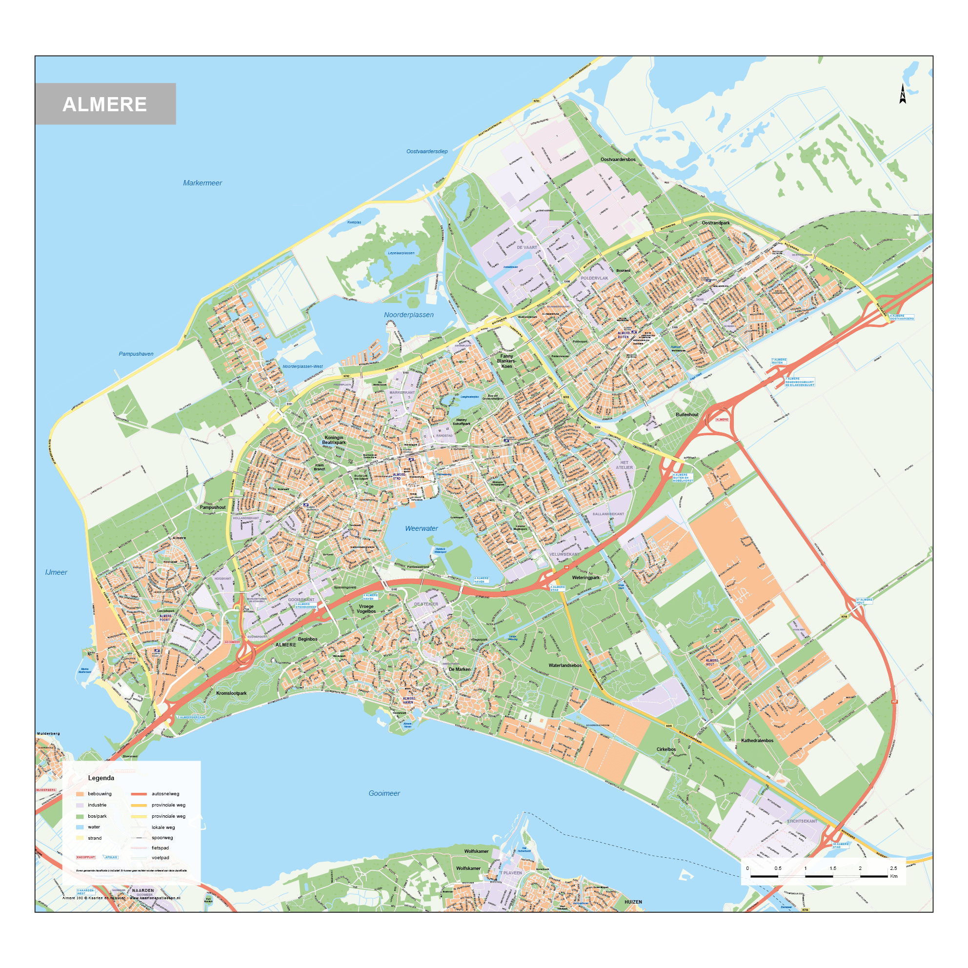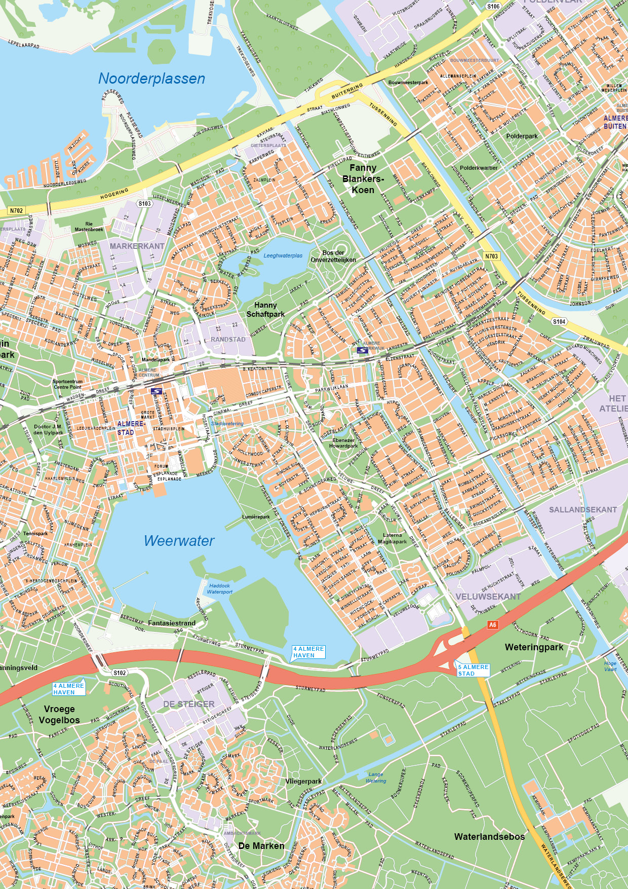 Straatnamenkaart van Almere. Geeft op een zeer duidelijke manier bijna alle straten weer. De kaart is in september 2019 geheel geüpdate. Bekijk ook onze andere stadsplattegronden van Nederland.