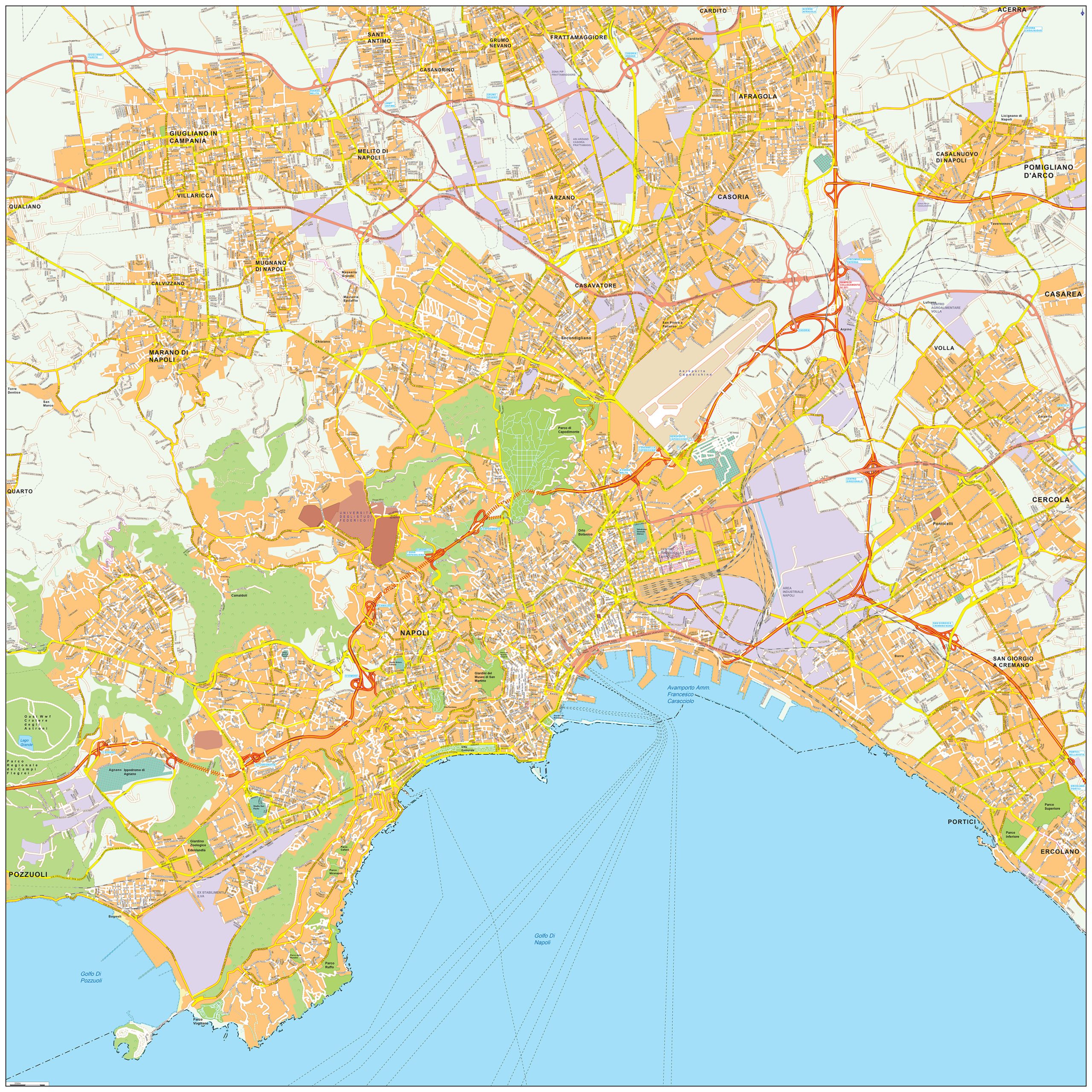 • Met de vaarroutes, wegen en spoorwegen van Napels en omgeving