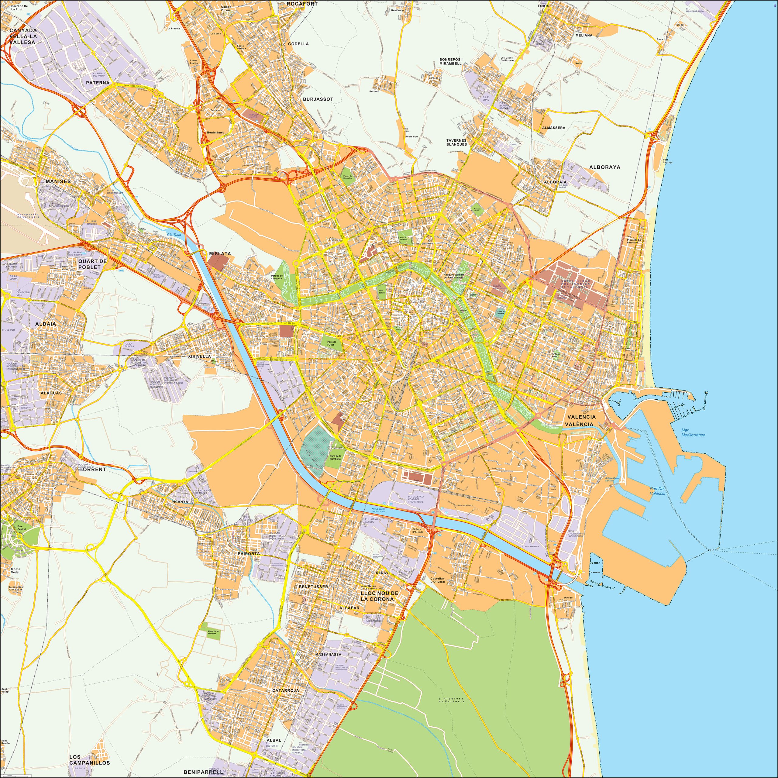 Straatnamenkaart van Valencia. Geeft op een zeer duidelijke manier bijna alle straten weer.