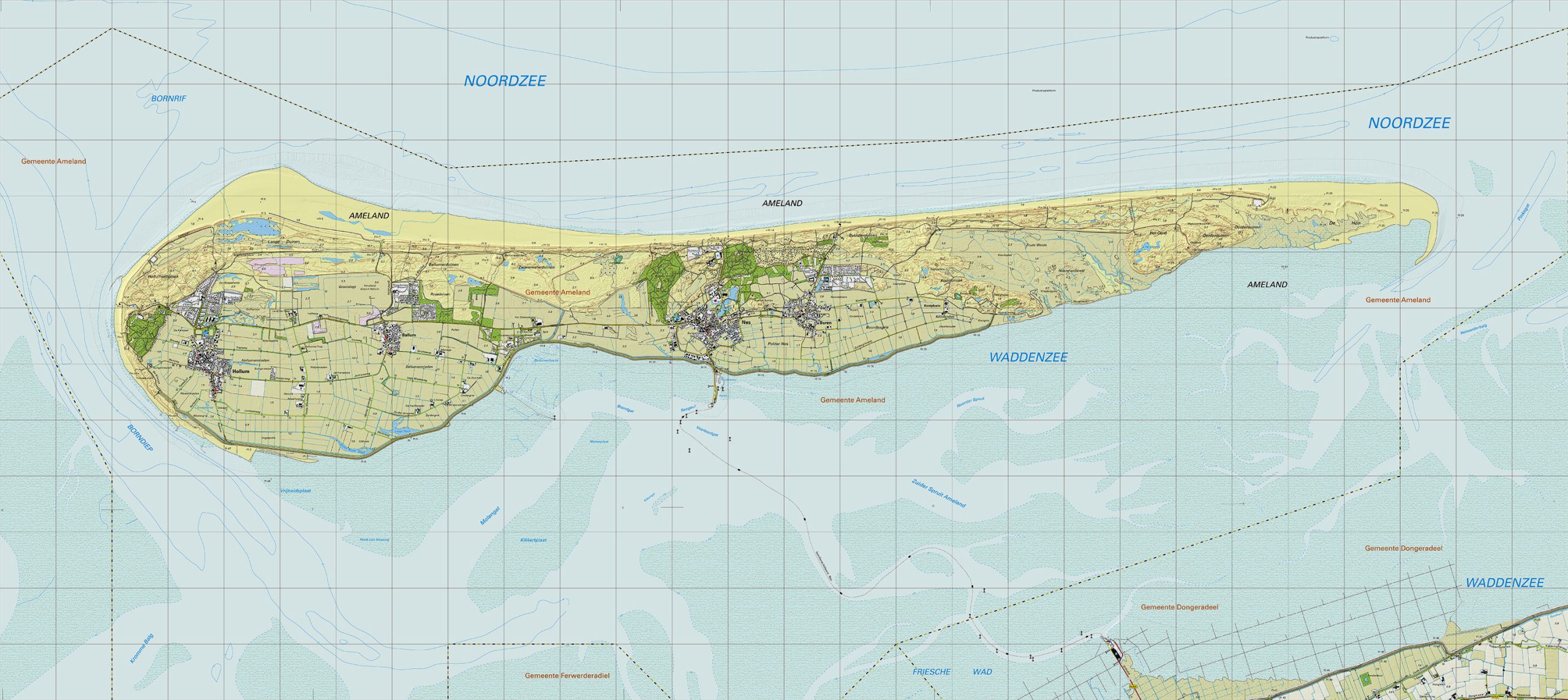 • Topografische wandkaart van Ameland in de schaal 1:25.000 formaat 110×50 cm