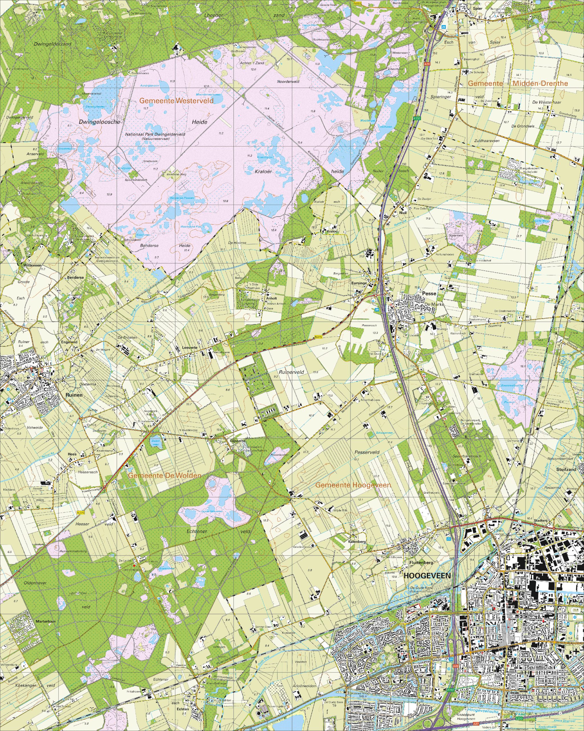 • De Dwingeloosche Heide met wateren en omringende bossen staat volledig weergegeven op deze kaart