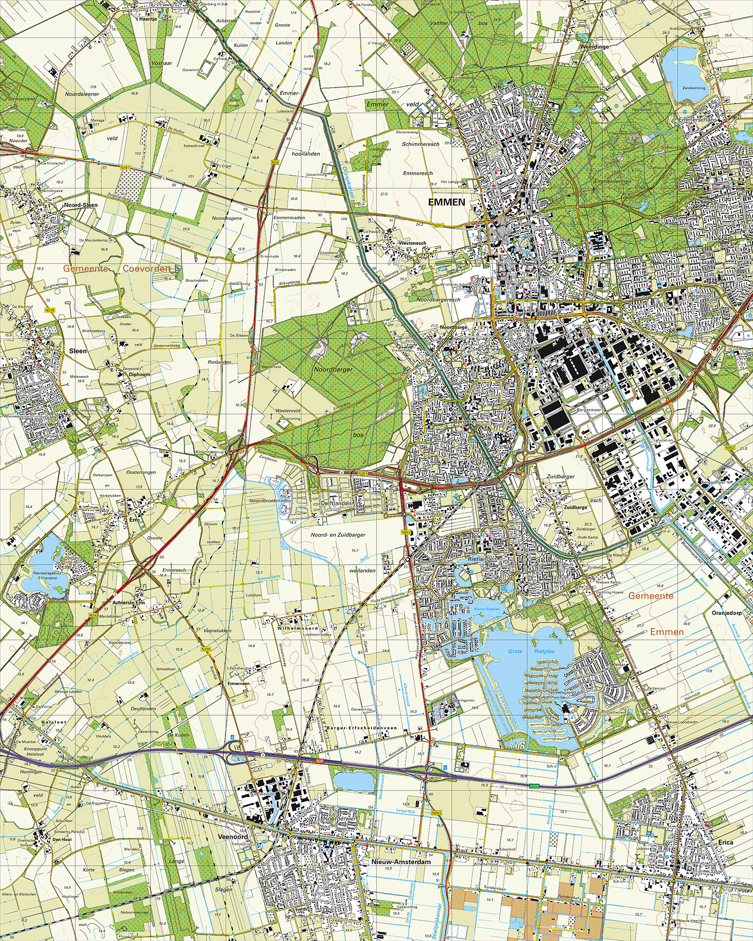 • Naast de gemeente Emmen staan ook het Noordbargerbos, de Emmerdennen, het Valtherbos en de recreatiegebieden Park Sandus en Ermerzand weergegeven