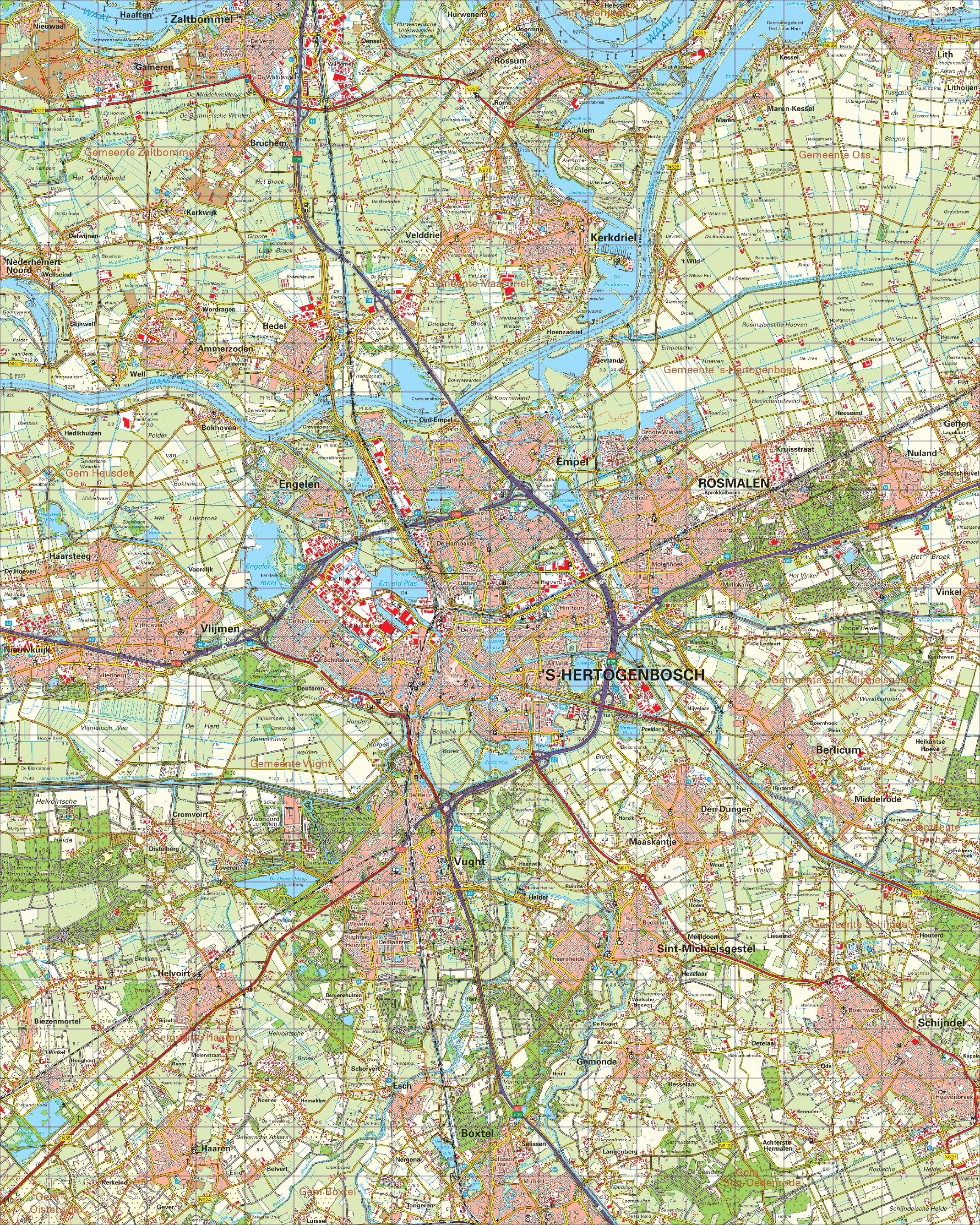 • Toont mooi de infrastructuur van ‘s-Hertogenbosch en omgeving met alle wegen, plaatsen en wateren zeer gedetailleerd weergegeven