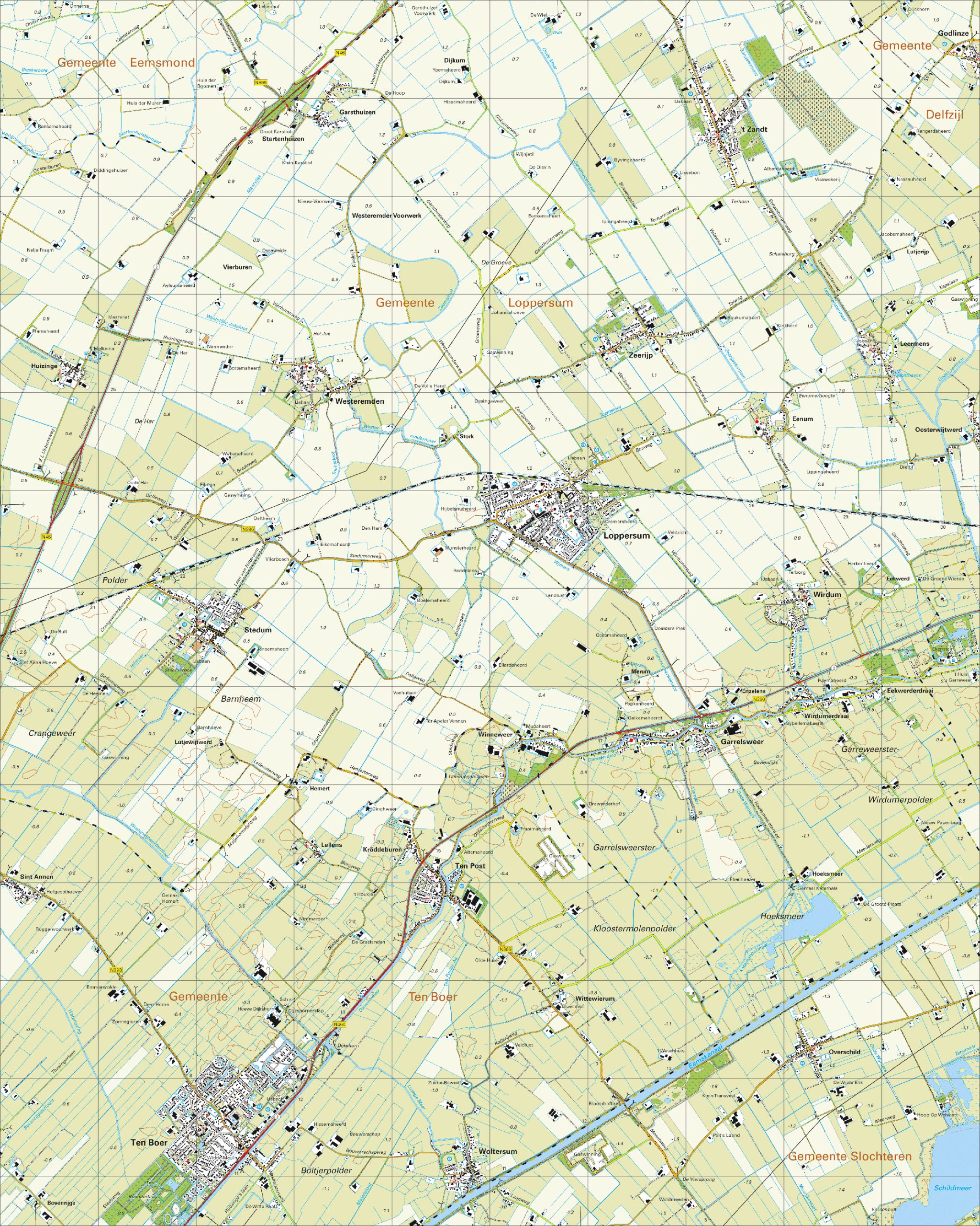 • Toont zeer nauwkeurig plaatsen, wegen, wateren, spoorwegen van Loppersum en omgeving