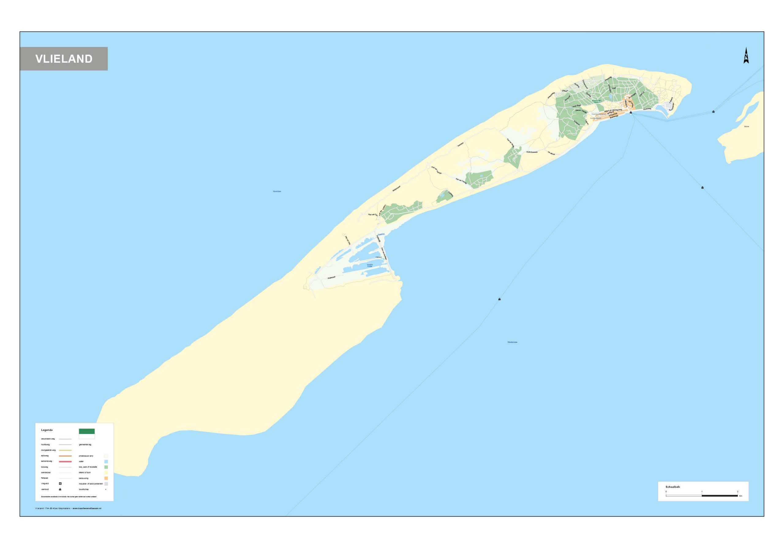 Zeer gedetailleerde Waddeneiland-kaart met alle wegen en fiets- en wandelpaden. Met plaats- en straatnamen. Door de kleuren is het grondgebruik duidelijk, zoals bos, park of recreatie, strand of duin en bebouwing. Met leuke extra’s zoals de vlag van het eiland en de veerverbindingen. Er zijn ook kaarten van Texel, Terschelling, Ameland en Schiermonnikoog.