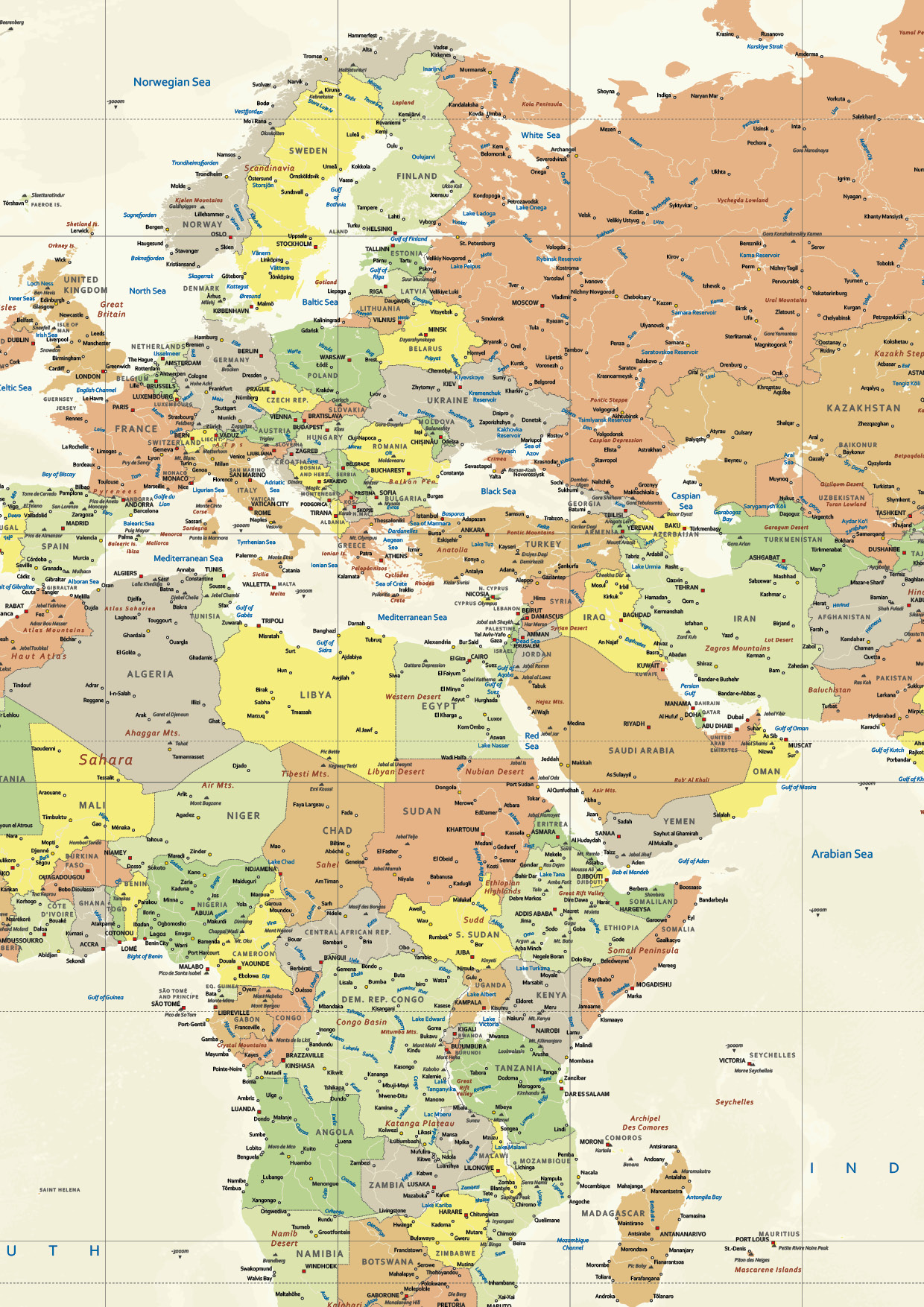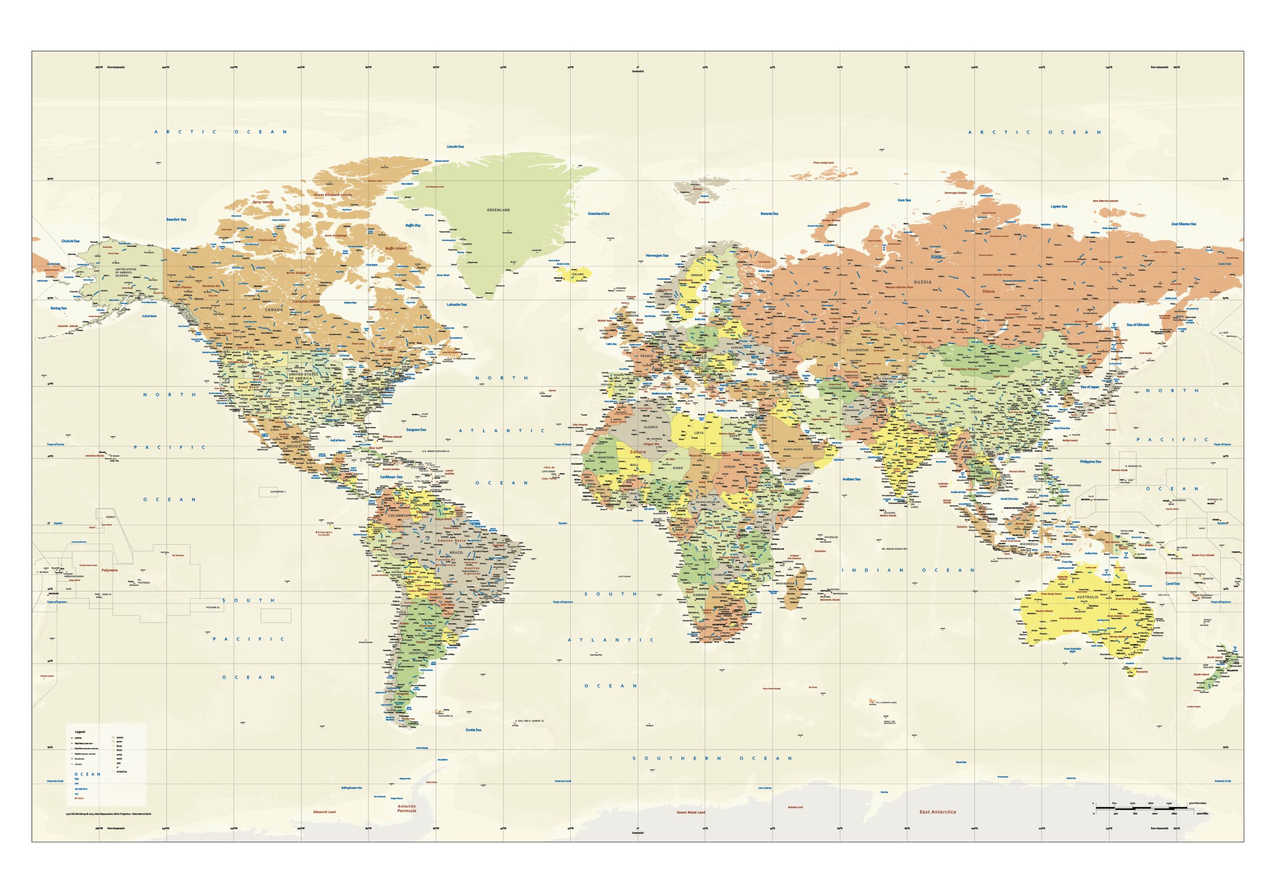 Grote wereldkaart in de Engelse taal in rustige pasteltinten. Een zeer gedetailleerde kaart met veel plaatsnamen. Meridianen en breedtegraden zijn weergegeven.