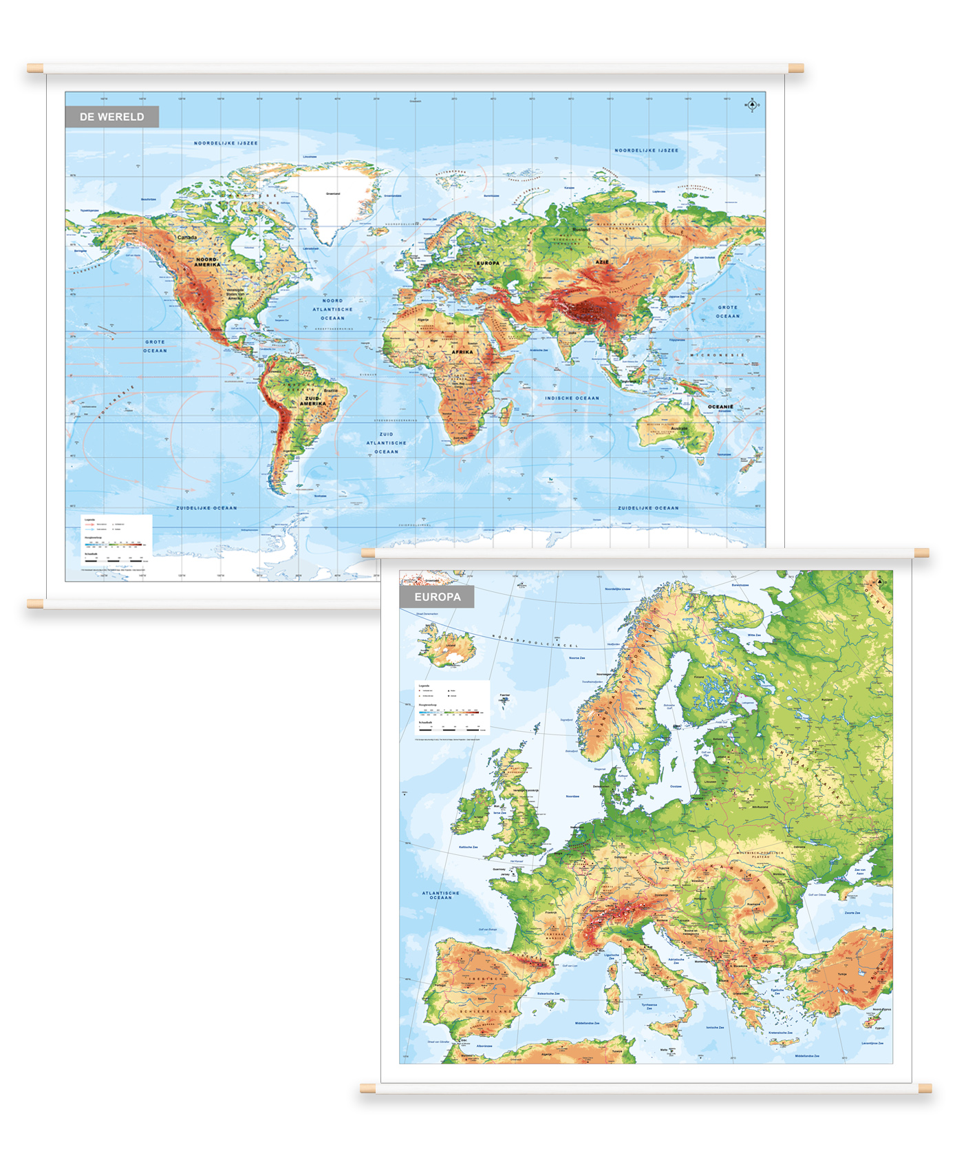 Natuurkundige en duidelijke kaarten van Europa en de wereld met alle landen, hoofdsteden, grotere steden, wateren en rivieren. De hoogten worden in tien verschillende kleuren weergegeven, in de bijgaande legenda wordt duidelijk gemaakt welke kleur aan welke hoogte is gekoppeld. Ideaal voor gebruik op scholen. De kaarten wordt standaard gedrukt op bisonyl (vrachtwagenzeil) met houten stokken als ophangsysteem. De kaarten zijn daardoor jarenlang te gebruiken, makkelijk op te rollen en uit te rollen. De kaarten hebben mooie kleuren, de vormgeving is eenvoudig en de teksten zijn goed leesbaar. Bekijk ook onze combideals voor staatkundige schoolkaarten.
