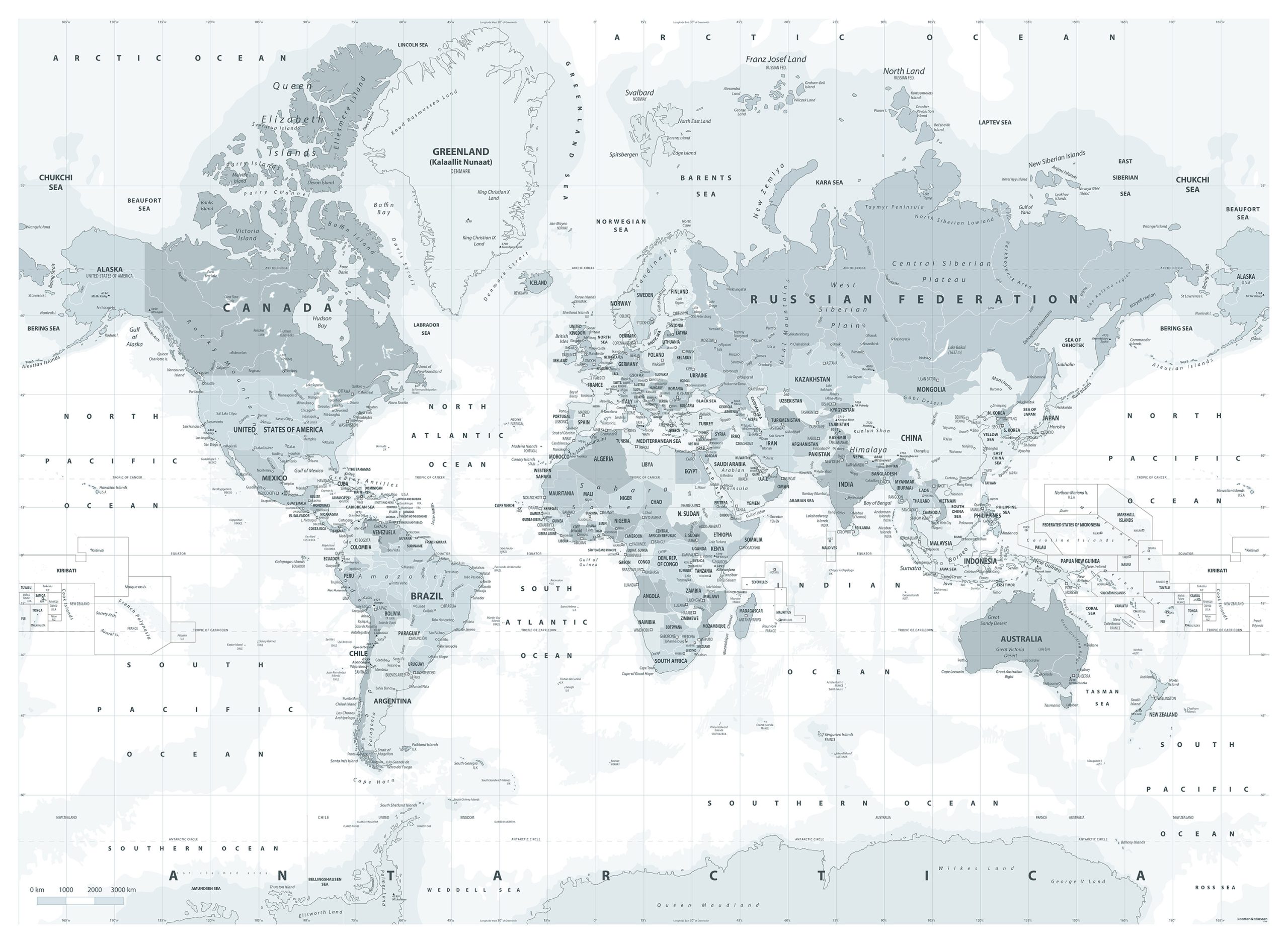 • Eigentijds vormgegeven wereldkaart in grijstinten
