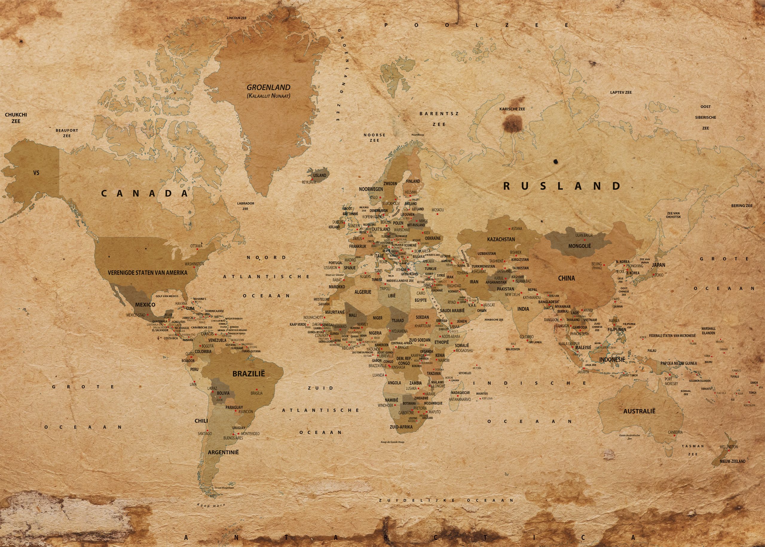 Staatkundige Wereldkaart in nostalgische kleuren, uitvoering in de Nederlandse taal. Op de kaart zijn zijn alle landen en hoofdsteden afgebeeld. Uiteraard zijn ook veel wateren, eilanden, zeeën, etc. afgebeeld en met naam weergegeven. Er is ook een gekleurde variant.