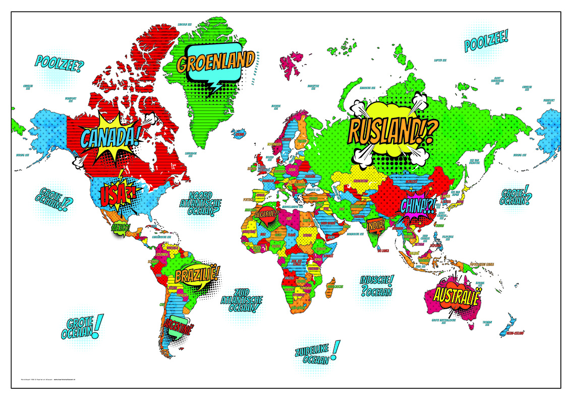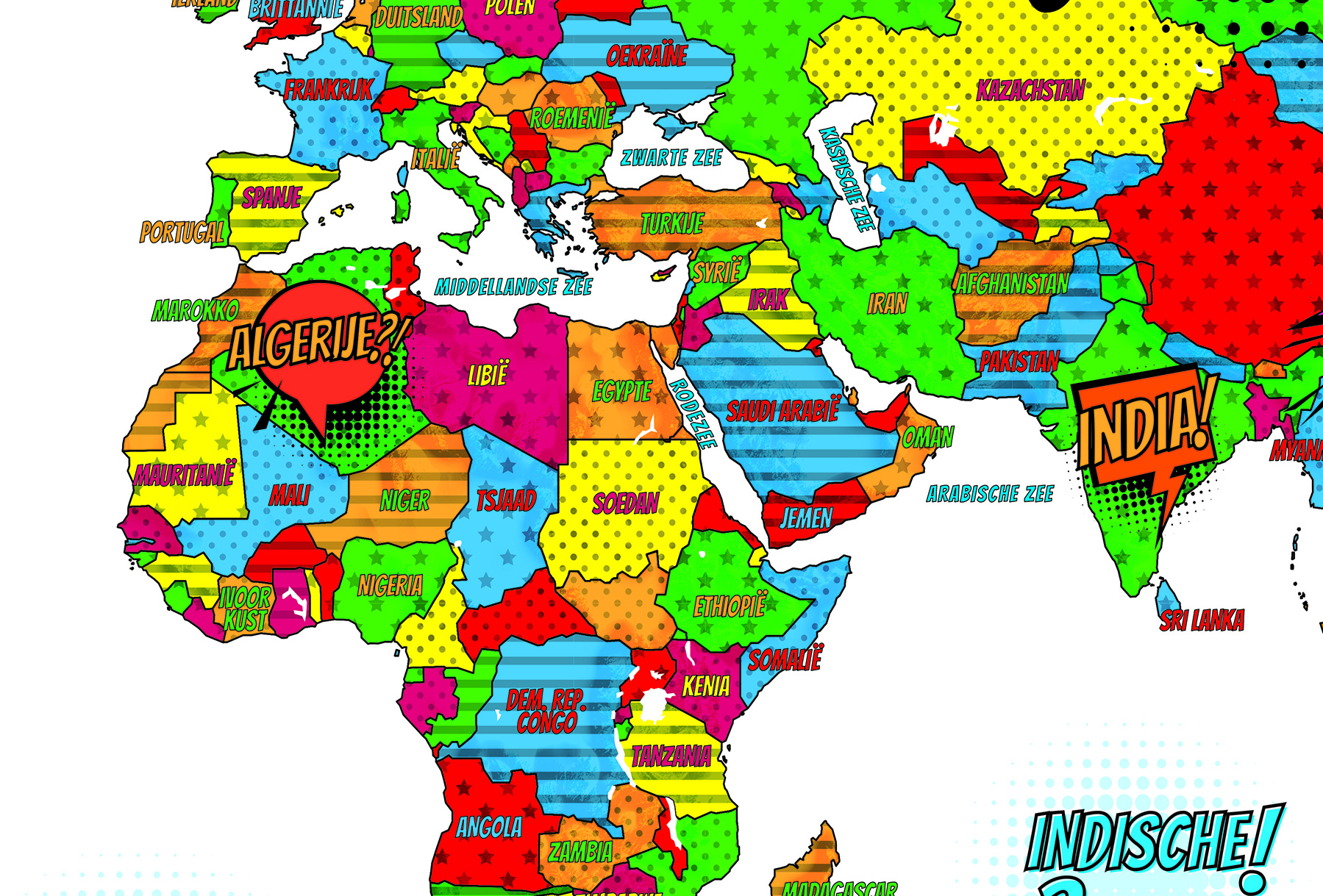 Deze Popart wereldkaart is gemaakt door onze eigen studio. Door de handmatige gemaakte teksten en gebruikte kleuren heeft de kaart een unieke en bijzondere uitstraling.