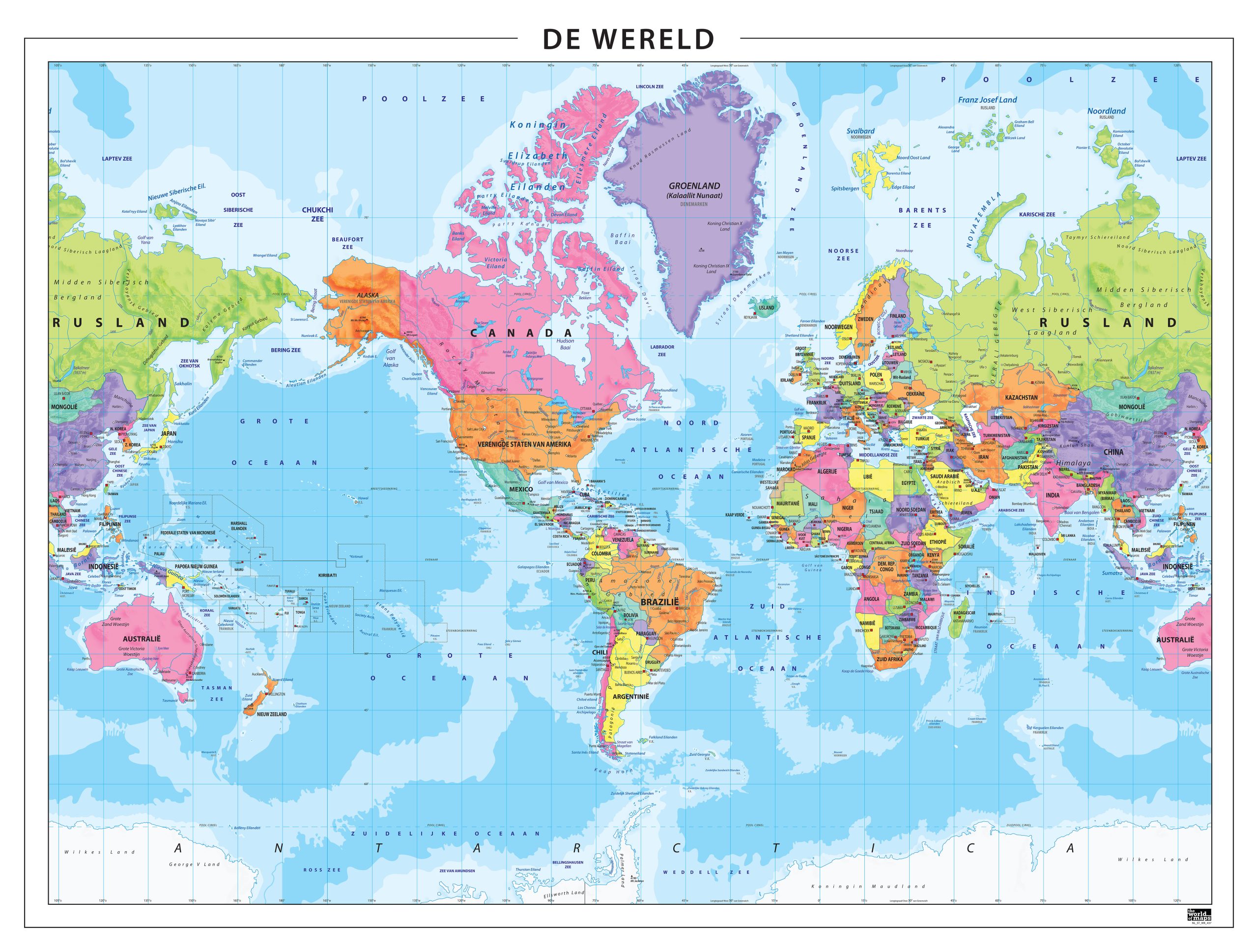 Een Amerikaans kaartbeeld van onze meest verkochte wereldkaart 101. Het gaat hier om een staatkundige Wereldkaart Nederlandstalig. Amerika is in het midden van de kaart geplaatst.