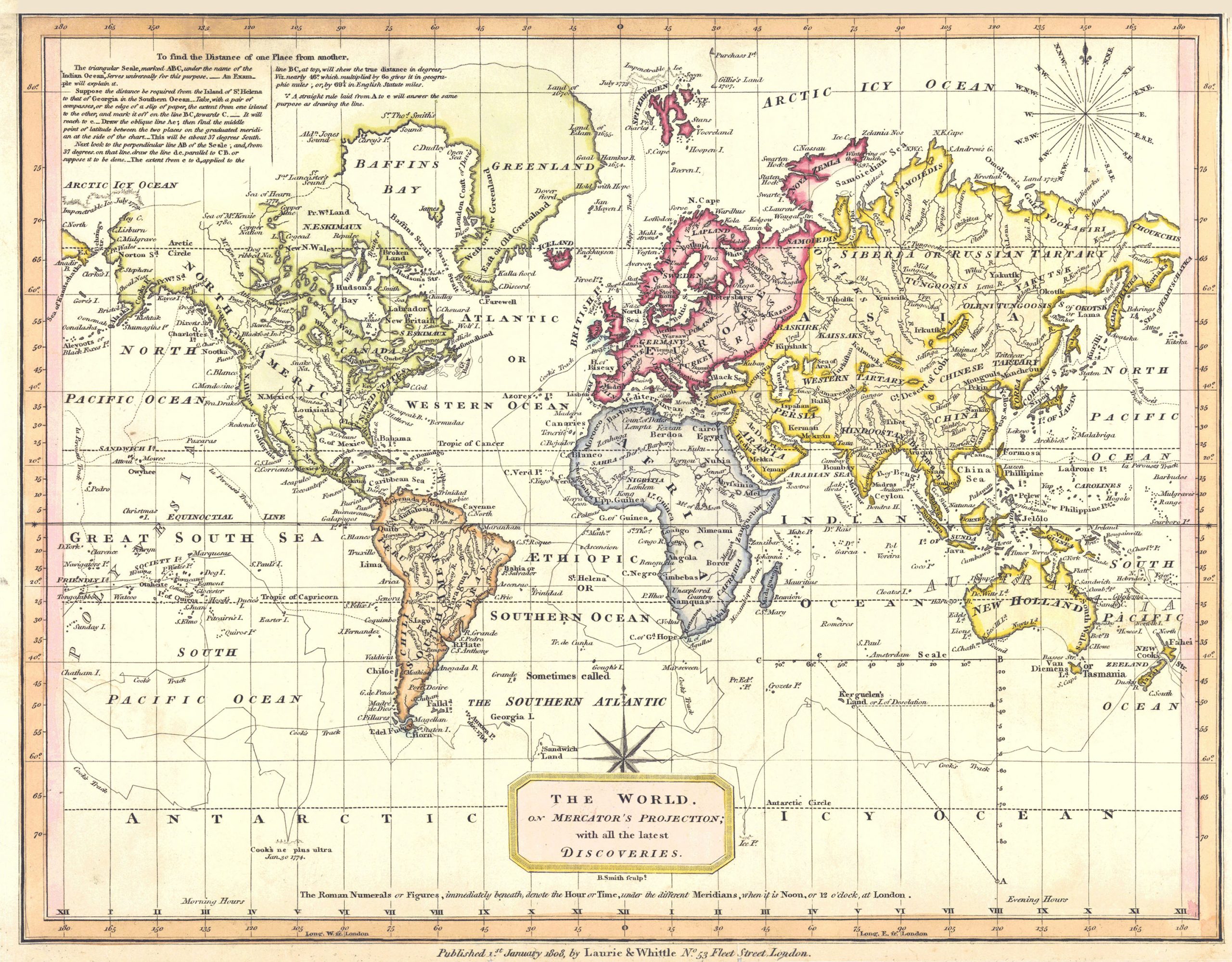 Decoratieve historische wereldkaart door Lauri en Whittle uit 1808. Replica van de originele gravure.