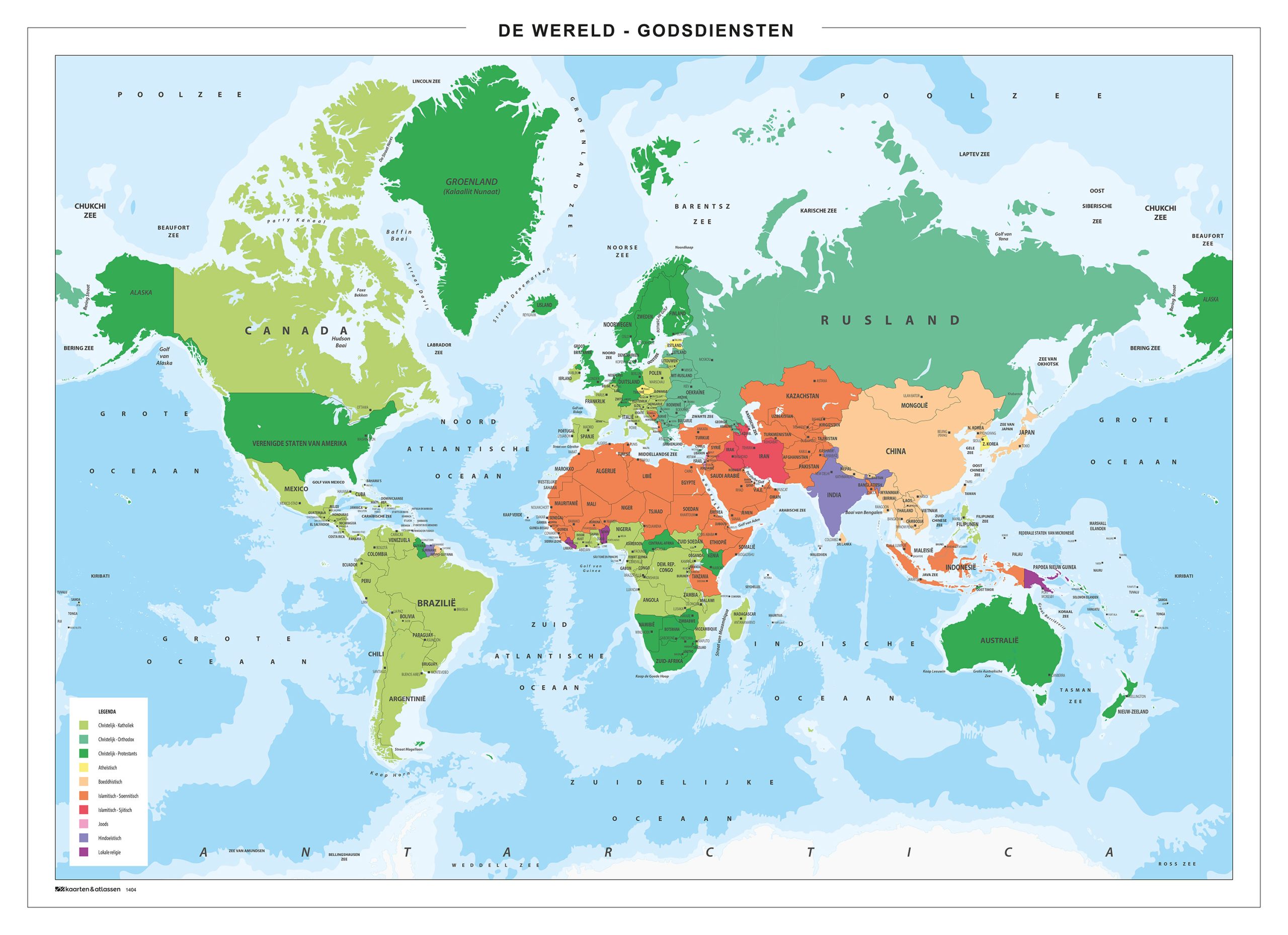 Duidelijke thematische wereldkaart uitgevoerd in de Nederlandse taal. Centraal staat de verspreiding van de verschillende Godsdiensten. Per land is de godsdienst weergegeven die met het hoogste percentage. Deze wereldkaart is duidelijk; alle landen, grote steden, grotere wateren en eilanden zijn afgebeeld.