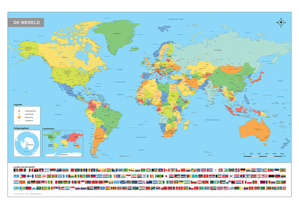 Staatkundige Wereldkaart in moderne uitvoering in de Nederlandse taal. Een staatkundige wereldkaart uitgevoerd in krachtige kleuren. Met van alle landen de nationale vlag. De kaart is uitermate geschikt voor scholen, kinderkamers maar ook voor mensen die op zoek zijn naar een duidelijke eenvoudige wereldkaart. De wereldkaart kan ook op andere formaten geleverd worden. We hebben ook een eenvoudige Continenten Wereldkaart 1267 en een Wereldkaart 1535 zonder vlaggen voor scholen.