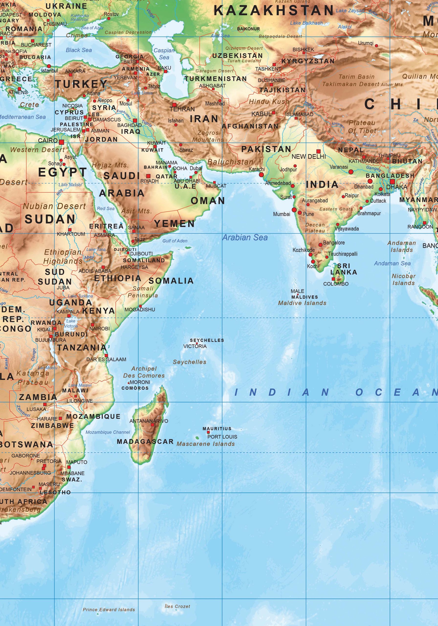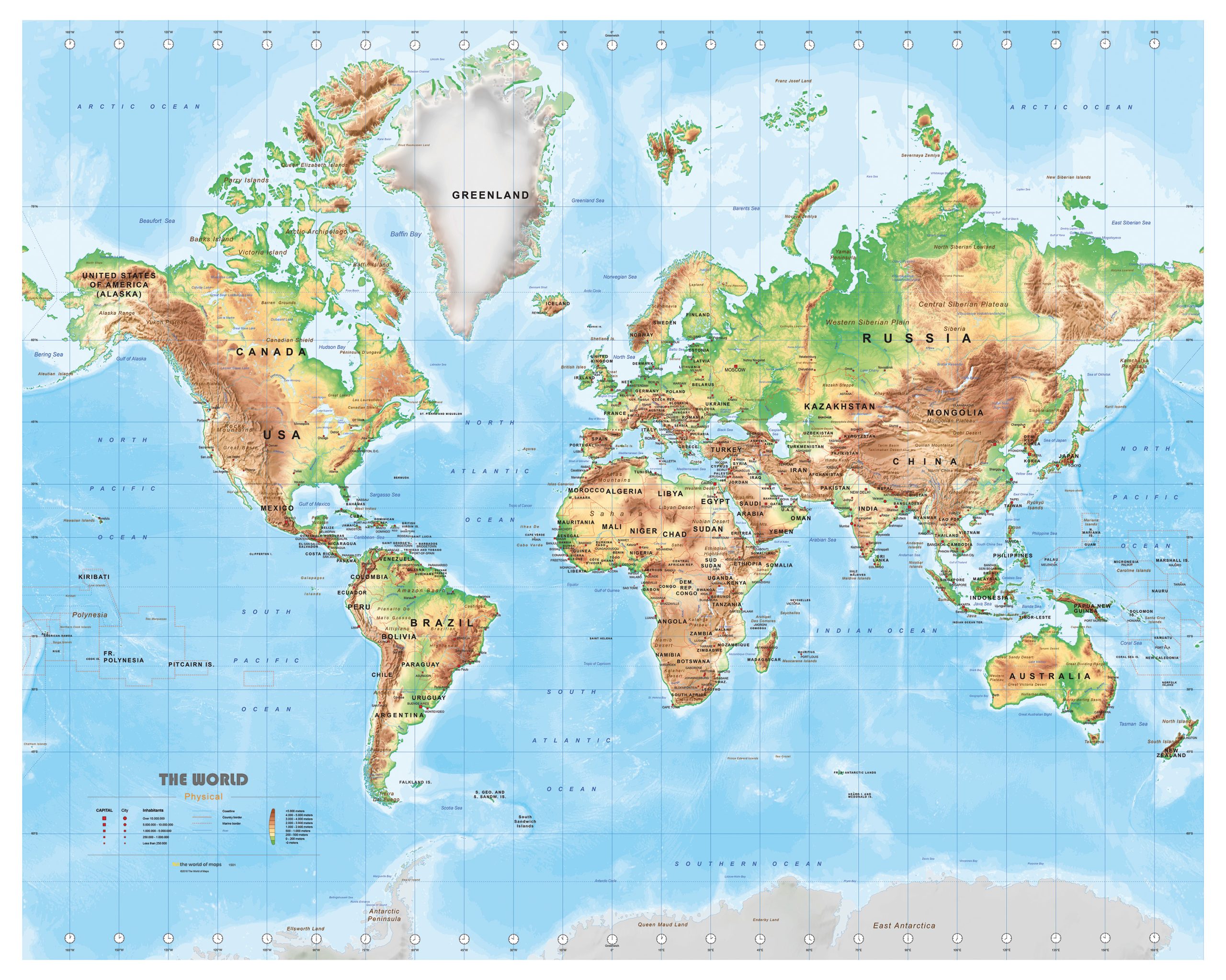Engelstalige natuurkundige wereldkaart.  We hebben in deze serie ook een environmentalkaart en een staatkundige kaart gemaakt, dit ter info. De kaart is een productie van onze eigen uitgeverij. Er zijn van deze kaart drie basis formaten; klein, medium en groot die ieder ook nog eens in diverse formaten beschikbaar zijn.  Deze kaart kan volledig aangepast worden aan uw wensen. Denk hierbij aan andere kleuren, andere projectie, meer of minder informatie, etc.. De kaart is ook digtaal verkrijgbaar.