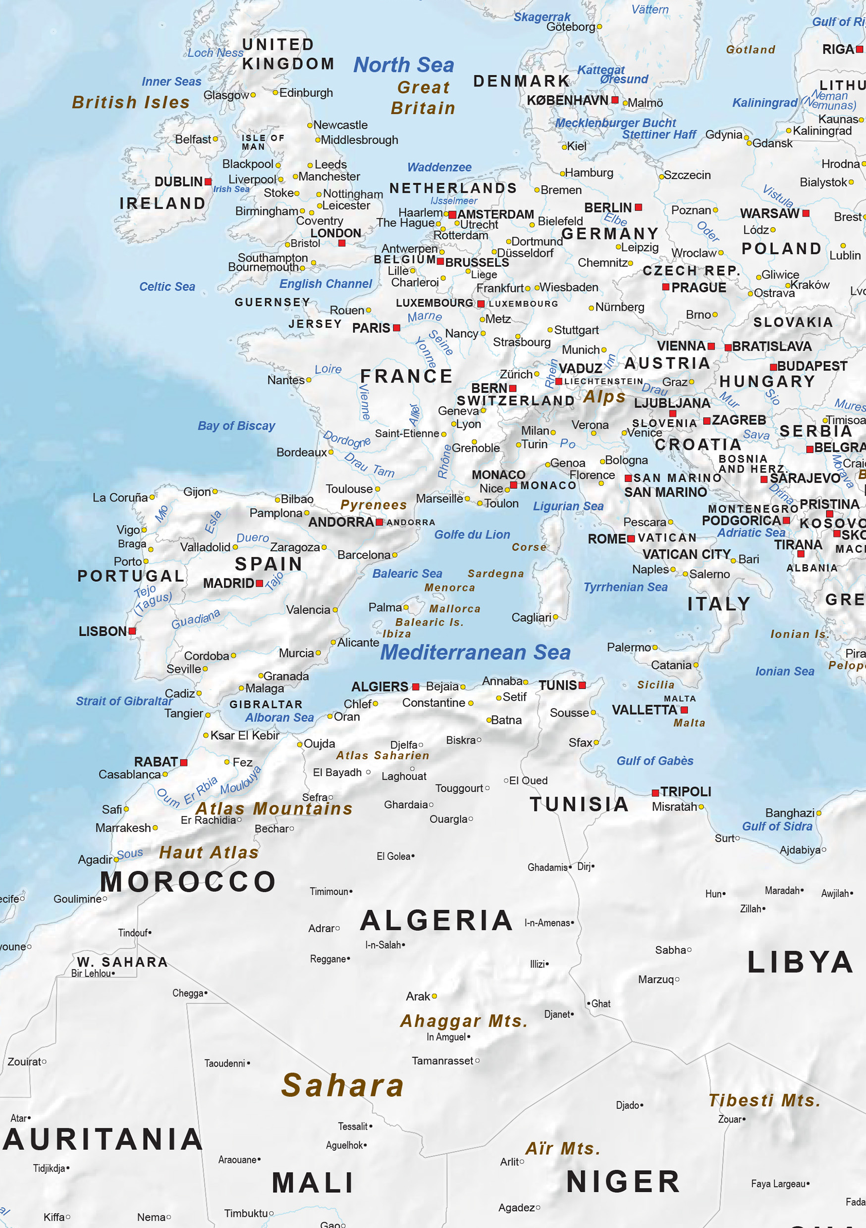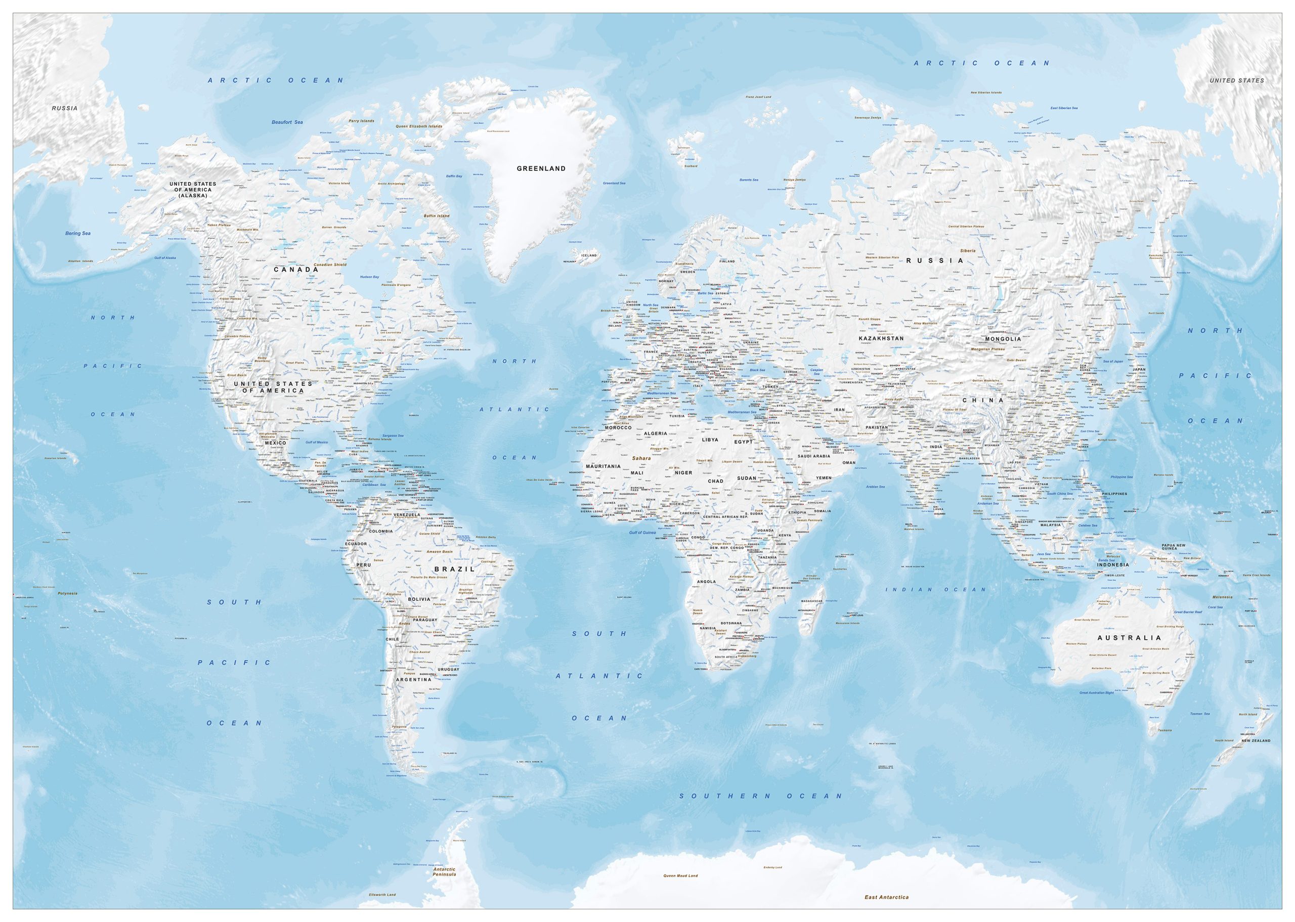 Engelstalige staatkundige wereldkaart met blauwe zee en wit land. De kaart is een productie van onze eigen uitgeverij. Deze kaart kan volledig aangepast worden aan uw wensen. Denk hierbij aan meer kleuren, andere projectie, meer of minder informatie. Ook leverbaar in gekleurde versie.