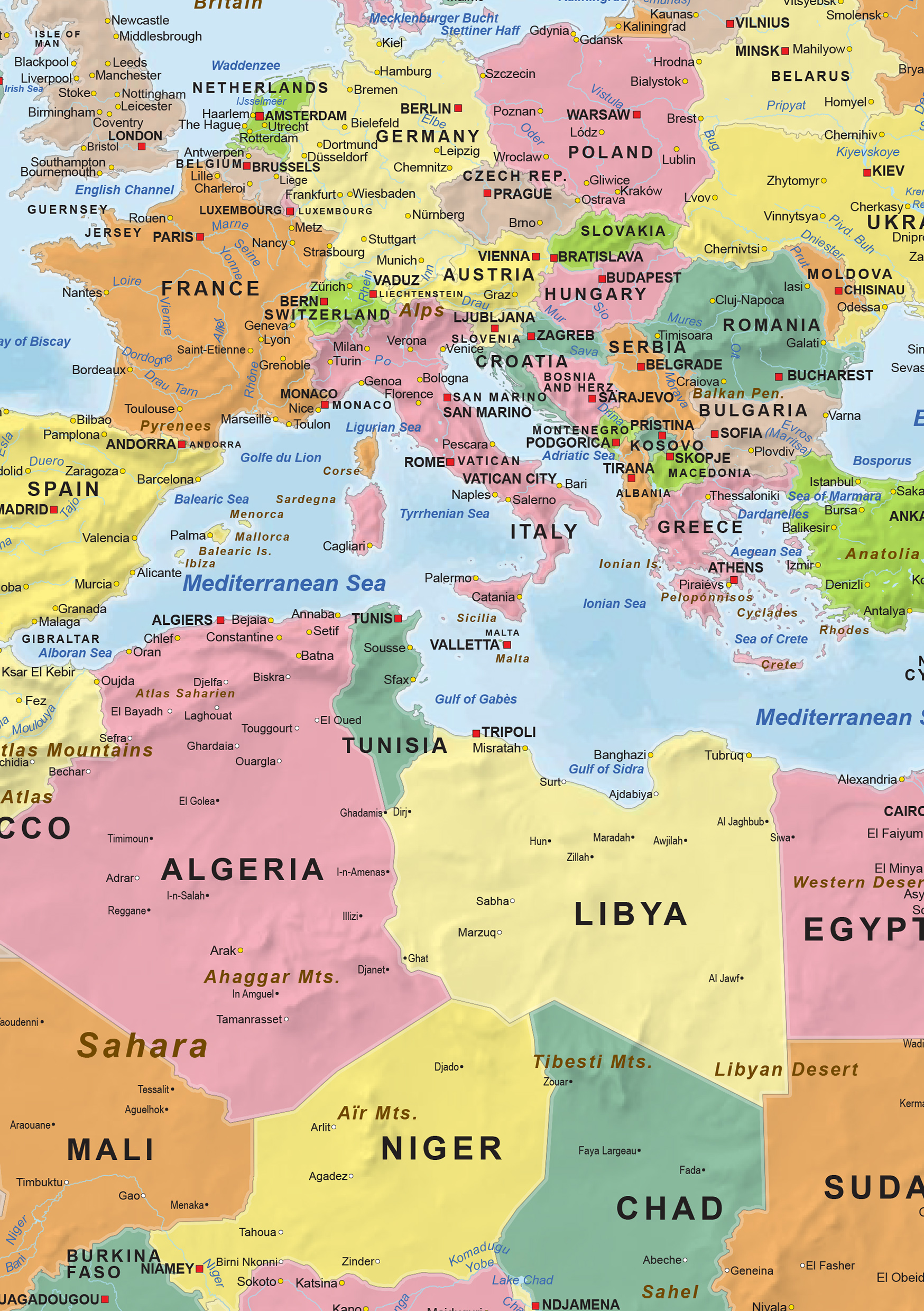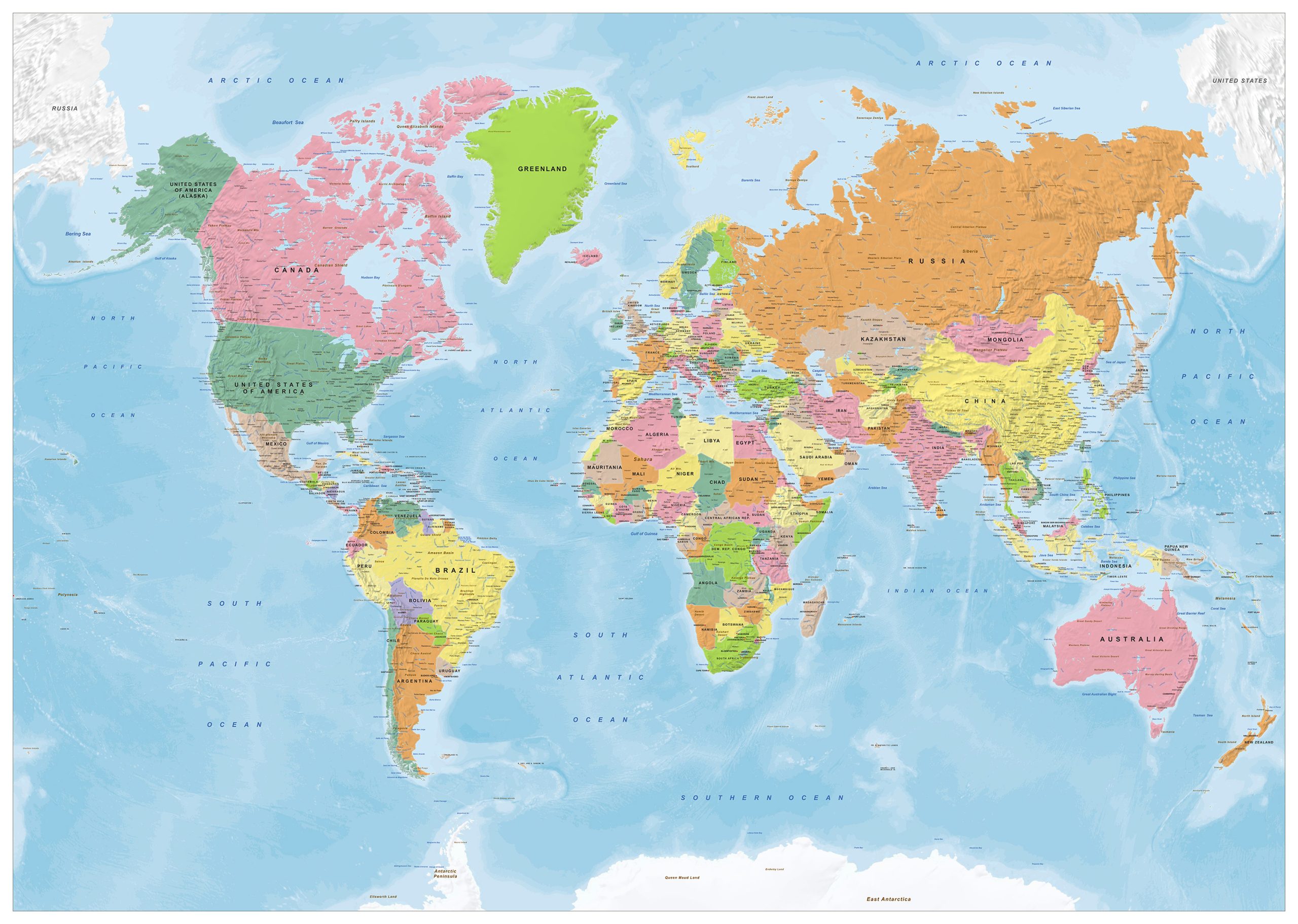 Engelstalige staatkundige wereldkaart in frisse kleuren. De kaart is een productie van onze eigen uitgeverij. Deze kaart kan volledig aangepast worden aan uw wensen. Denk hierbij aan andere kleuren, andere projectie, meer of minder informatie. Ook leverbaar in ongekleurde versie.
