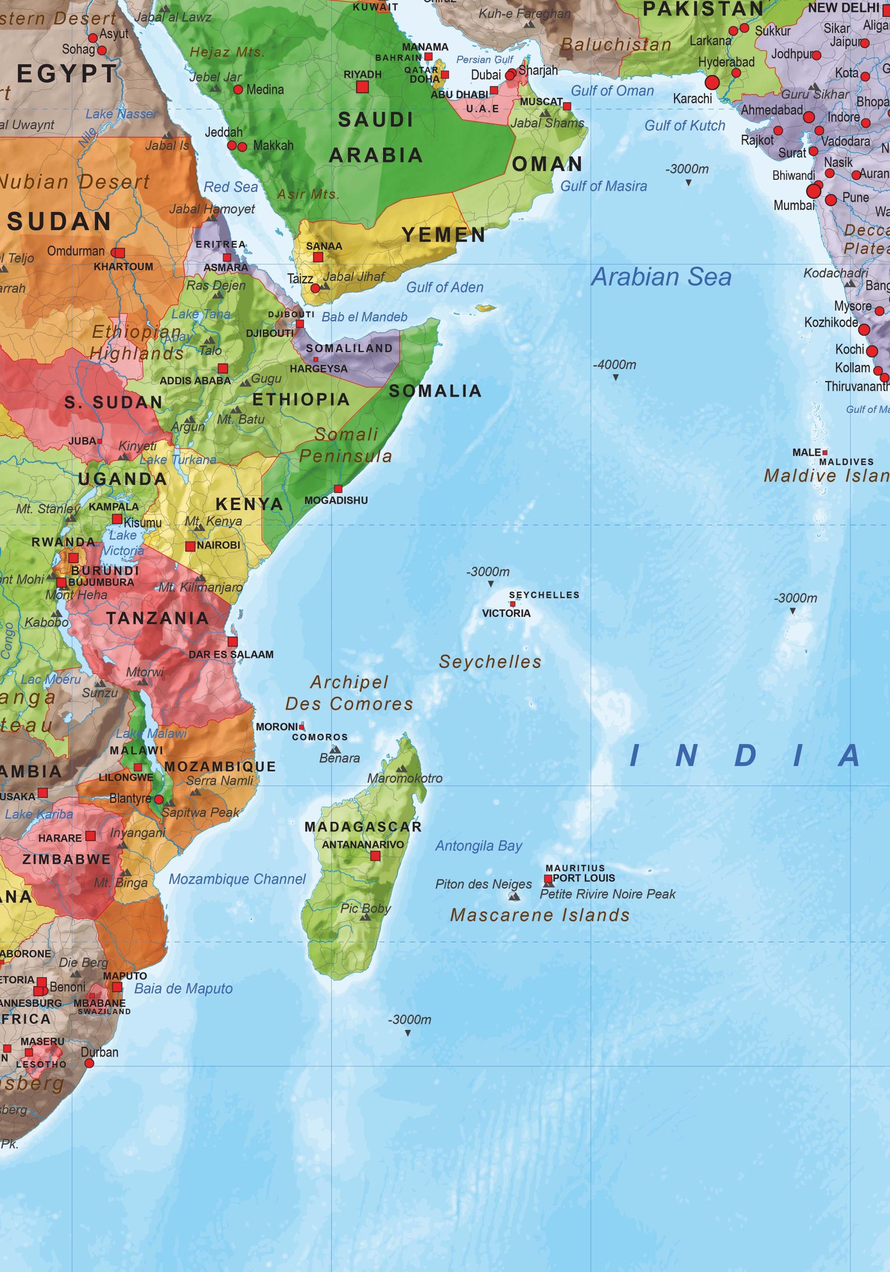 Engelstalige staatkundige wereldkaart in heldere kleuren. De kaart is een productie van onze eigen uitgeverij. Er zijn van deze kaart drie basisformaten; klein, medium en groot. Iedere kaart is in diverse formaten beschikbaar. Er zijn van deze kaart ook twee natuurkundige varianten. De kaart kan volledig aangepast worden aan uw wensen. Denk hierbij aan andere kleuren, een andere projectie, meer of minder informatie, en meer. De kaart is ook als digitale kaart verkrijgbaar.
