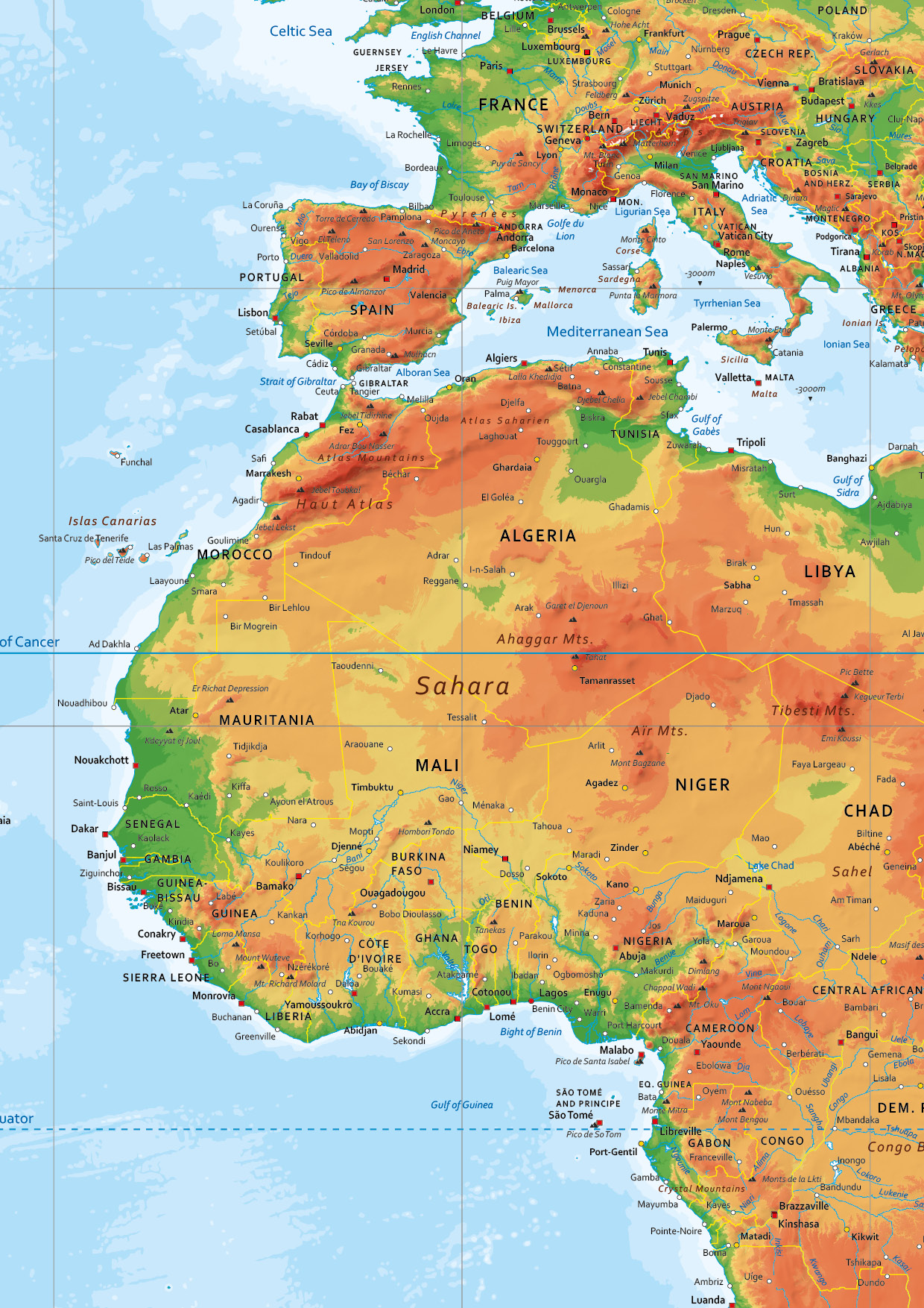 Engelstalige natuurkundige wereldkaart. Een zeer gedetailleerde wereldkaart op mega groot formaat. Naast de hoogtes worden er ook heel veel plaatsen, wateren en eilanden weergegeven, uiteraard ook alle landen en landnamen. Deze XXL kaart is ook in kleinere formaten te bestellen.