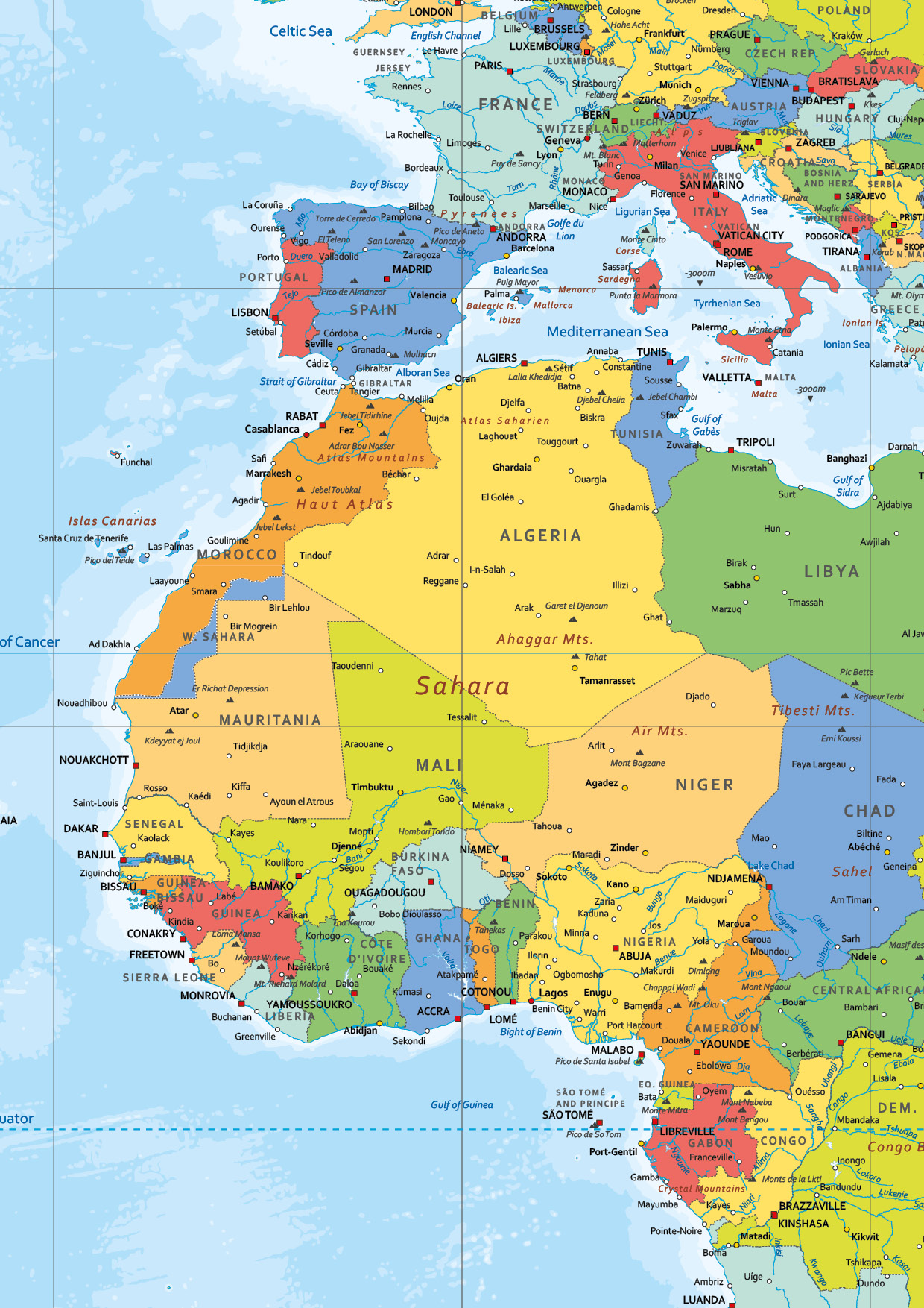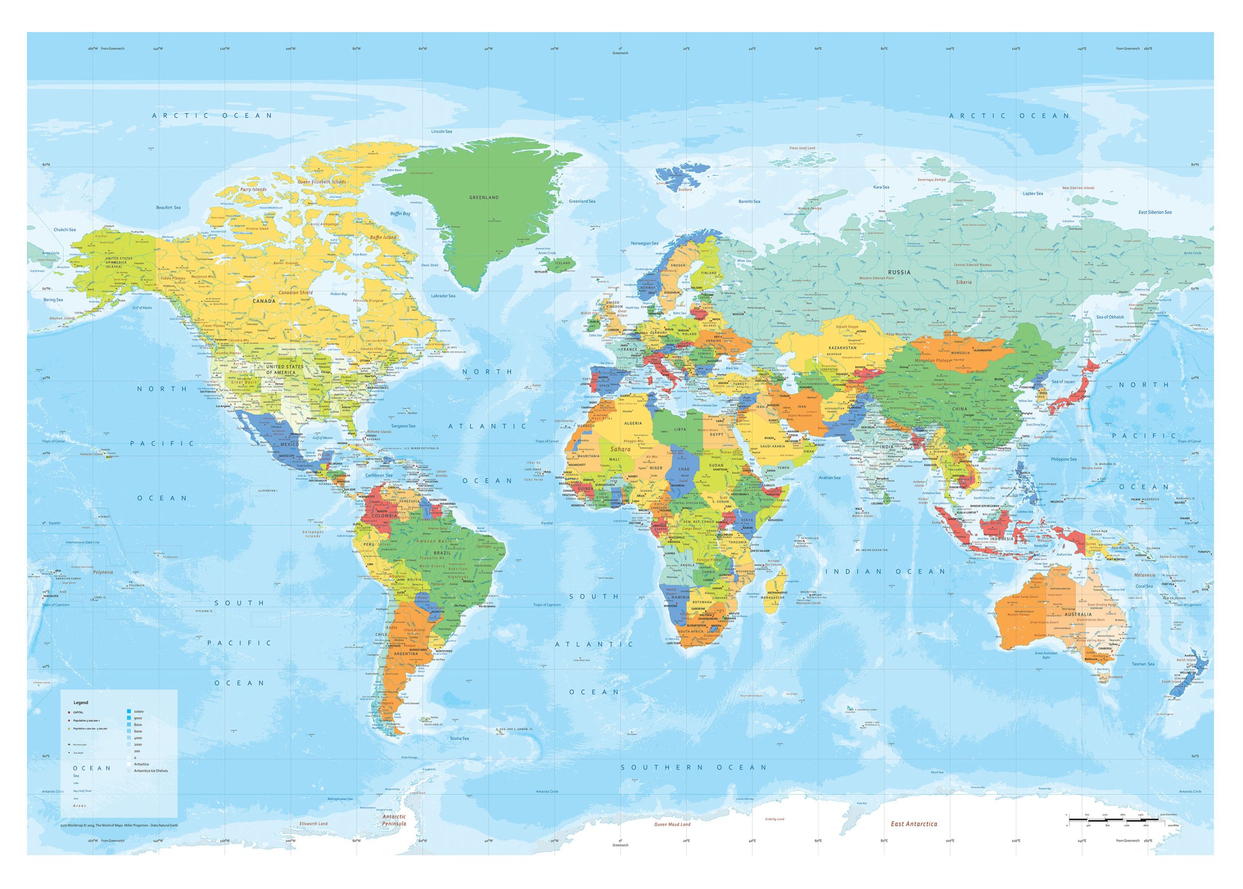 Wereldkaart in moderne uitvoering in de Engelse taal. Een zeer gedetailleerde kaart op mega groot formaat. De kaart is in heldere kleuren vormgegeven. Alle teksten, en dat zijn er heel veel, staan duidelijk op de kaart. Van de USA, India en Australië zijn ook de staten duidelijk zichtbaar. De kaart is in de Miller projectie weergegeven. Andere uitvoeringen zoals behang zijn ook mogelijk. De kaart is ook in kleinere formaten te bestellen.